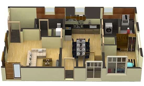 A fully self-contained house, featuring 5 bedrooms (sleeps 10), a kitchen, connected dining room and spacious lounge area.